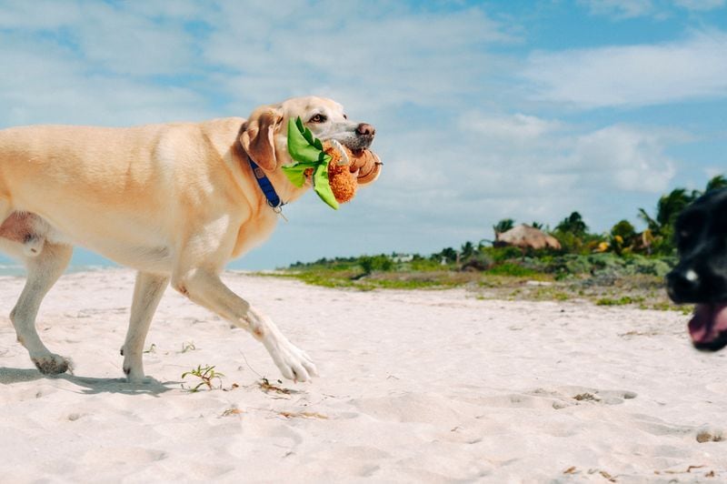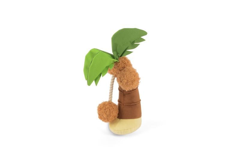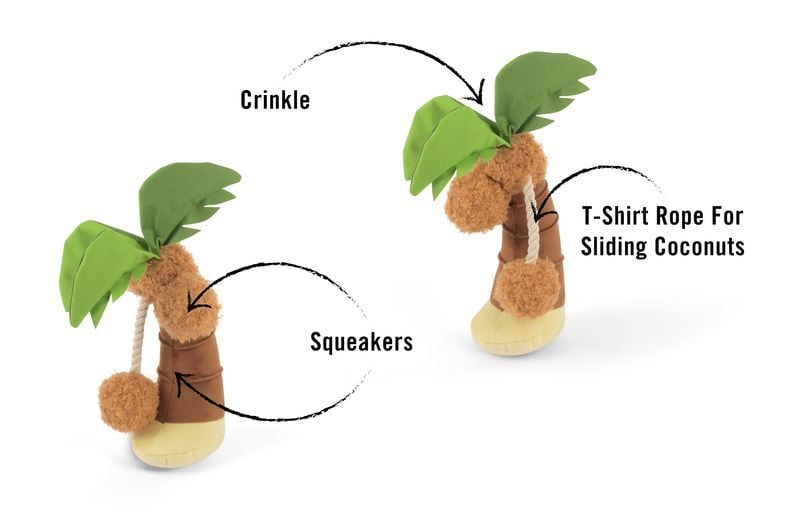 風にそよぐようなカサカサ音の鳴るヤシの葉と、スクイーカー内蔵のココナッツ。さらに幹の部分にはスライドするロープが通っていて、「引っ張りっこ遊び」が大好きなワンちゃんにぴったりのデザインです。これ一つで、噛んで、鳴らして、引っ張って……愛犬の「楽しい」を全部叶える贅沢なドッグトイです。